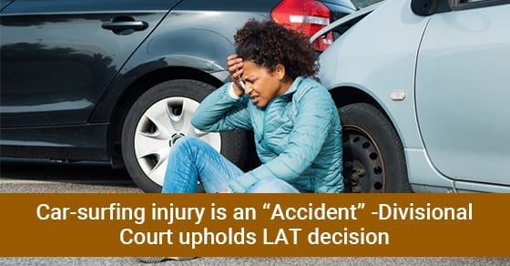 In Charbonneau v. Intact Insurance Company, Intact appealed a decision of the Licence Appeal Tribunal (LAT), claiming that the claimant, Ms. Charbonneau had not been injured in an "Accident" and did not qualify for accident benefits coverage.