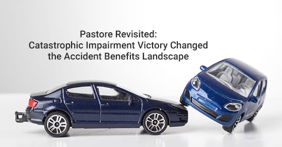 At issue was the definition of "catastrophic impairment" under the Statutory Accident Benefits Schedule (SABS), and whether Mrs. Pastore qualified for enhanced benefits under that definition. As the difference in benefits entitlement was nearly an additional $2 million, Aviva was strongly opposed to her application for determination of catastrophic impairment. As well, if Mrs. Pastore was successful, potentially thousands of other applicants with similar impairments might also be entitled to enhanced benefits under the SABS.