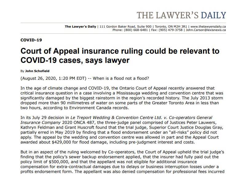 In the age of climate change and COVID-19, the Ontario Court of Appeal recently answered that critical insurance question in a case involving a Mississauga wedding and convention centre that was significantly damaged by the biggest rainstorm in the region’s recorded history. The July 2013 storm dropped more than 90 millimetres of water on some parts of the Greater Toronto Area in less than two hours, according to Environment Canada records.