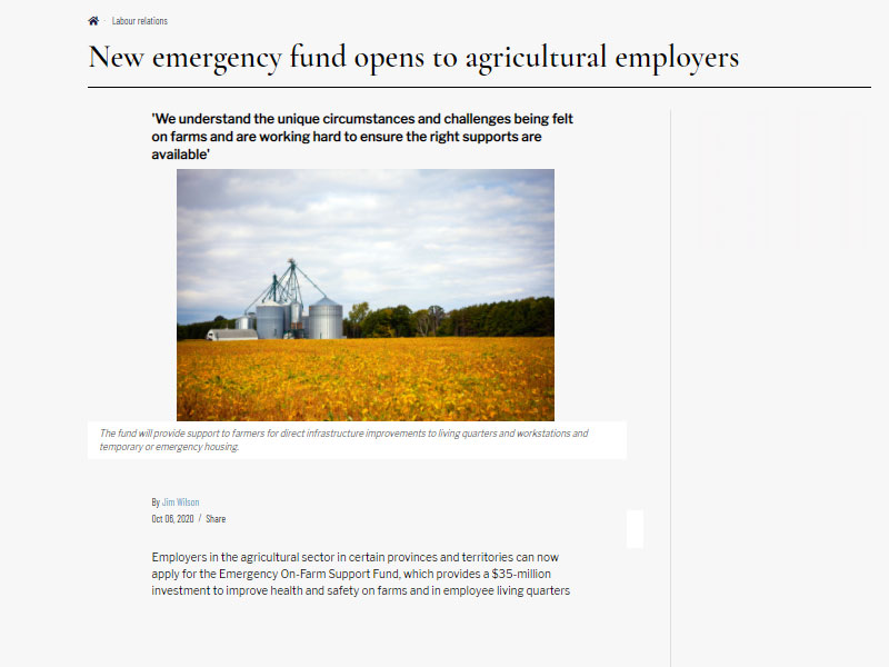 Employers in the agricultural sector in certain provinces and territories can now apply for the Emergency On-Farm Support Fund, which provides a $35-million investment to improve health and safety on farms and in employee living quarters to prevent the spread of COVID-19.