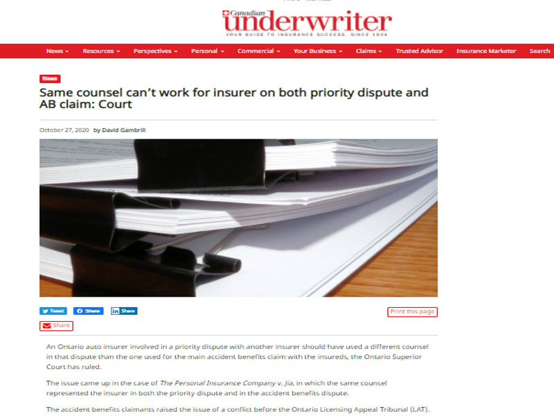 The issue came up in the case of The Personal Insurance Company v. Jia, in which the same counsel represented the insurer in both the priority dispute and in the accident benefits dispute.