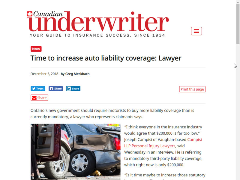 “I think everyone in the insurance industry would agree that $200,000 is far too low,” Joseph Campisi of Vaughan-based Campisi LLP Personal Injury Lawyers, said Wednesday in an interview. He is referring to mandatory third-party liability coverage, which right now is only $200,000.