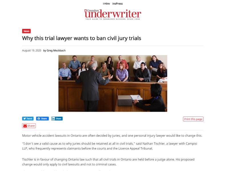 “I don’t see a valid cause as to why juries should be retained at all in civil trials,” said Nathan Tischler, a lawyer with Campisi LLP, who frequently represents claimants before the courts and the Licence Appeal Tribunal.
